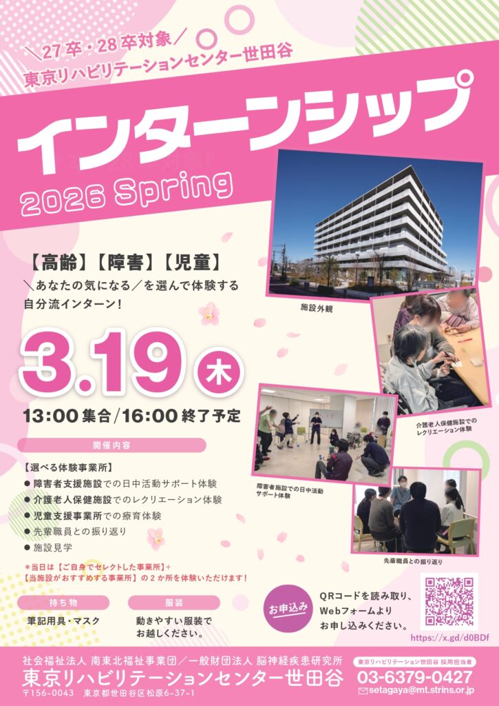 この度、東京リハビリテーションセンター世田谷にて『インターンシップ 2026 Spring』を開催致します。